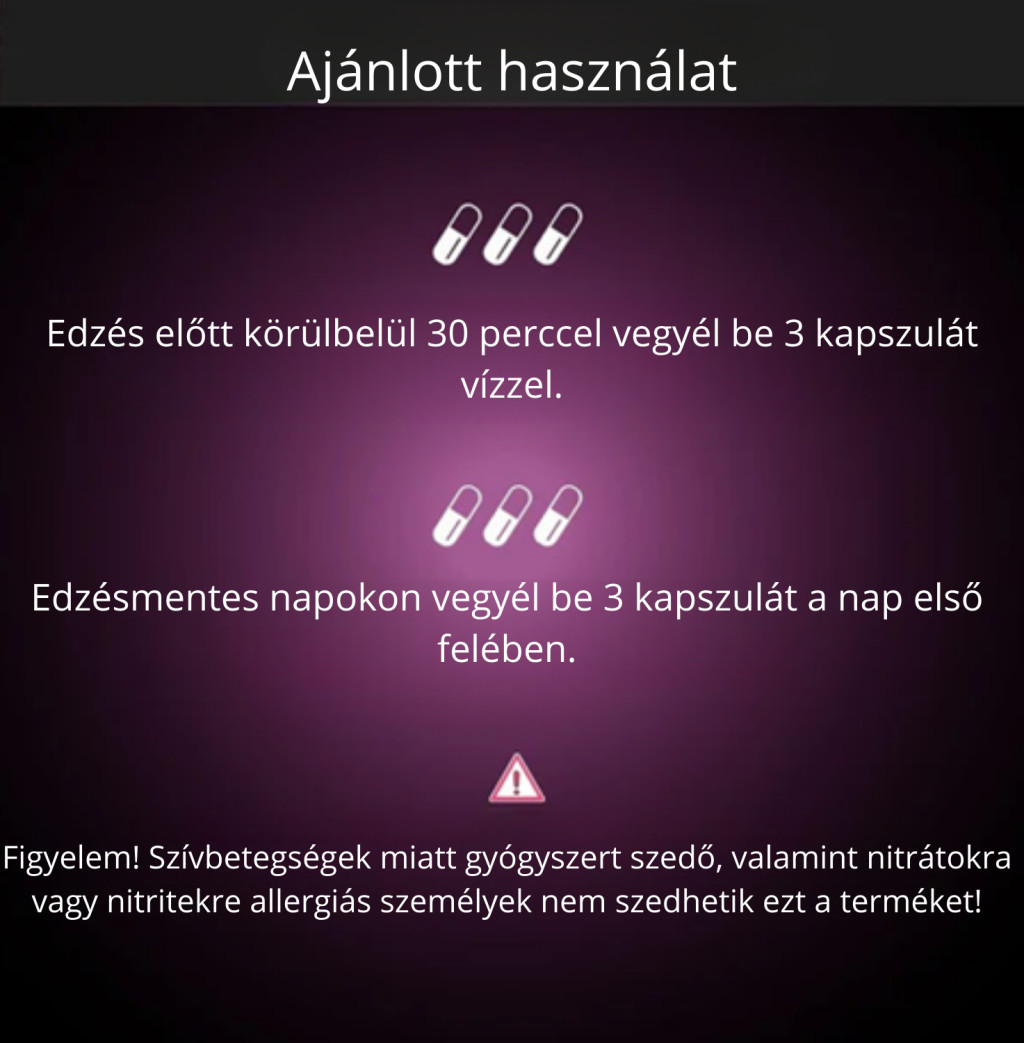 A kapszula bevétele után kb. 30-60 perccel már érezhető az erek tágulása és a jobb bedurranás/oxigénellátás. Azonban a tudomány szerint a legjobb eredményt akkor éred el, ha „feltöltést” végzel: egy fontos verseny előtt 3-5 napig szedd folyamatosan, hogy a nitrátszinted az egekben legyen a rajt pillanatában.